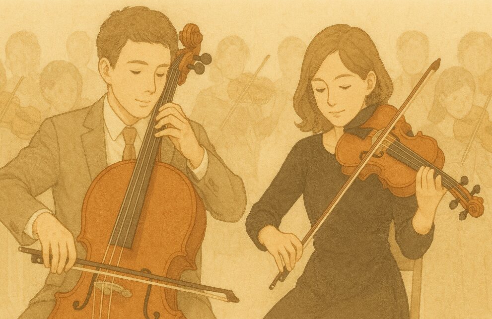 配置上の位置も音の広がりに影響し、ヴァイオリンは高域の明るさで全体を牽引し、チェロは厚みと陰影で音場を支えます。両者の役割が噛み合うことで、作品の立体感が際立ちます。